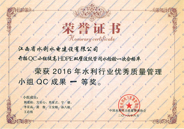 我公司5項QC成果獲得2016年水利行業(yè)優(yōu)秀成果獎