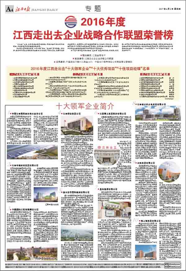 6月3日,江西走出去企業(yè)戰(zhàn)略合作聯(lián)盟2017年大會(huì)在南昌召開。省委常委、常務(wù)副省長毛偉明出席大會(huì)并作重要講話,會(huì)上省委常委、常務(wù)副省長毛偉明、省政府秘書長王亞聯(lián)和省商務(wù)廳廳長王水平分別為2016年度全省走出去“十大領(lǐng)軍企業(yè)”、“十大優(yōu)秀項(xiàng)目”和“十佳項(xiàng)目經(jīng)理”授牌。江西走出去企業(yè)戰(zhàn)略合作聯(lián)盟輪值主席、中國江西國際經(jīng)濟(jì)技術(shù)合作公司總經(jīng)理徐國建報(bào)告了2016年工作,國家開發(fā)銀行江西分行、中國進(jìn)出口銀行江西省分行和中國出口信用保險(xiǎn)公司南昌營管部作為聯(lián)盟副主席單位發(fā)言。公司董事長王元旦作為十大優(yōu)秀項(xiàng)目的企業(yè)代表發(fā)言。《江西日?qǐng)?bào)》、《江西衛(wèi)視》相繼對(duì)大會(huì)進(jìn)行了大幅報(bào)道。