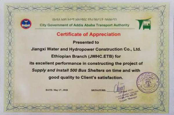 近日,埃塞有限公司收到亞的斯亞貝巴市交通局頒發(fā)的感謝證書,表彰公司在承建亞的斯亞貝巴市500套公交候車亭供貨與安裝項(xiàng)目上表現(xiàn)優(yōu)異。