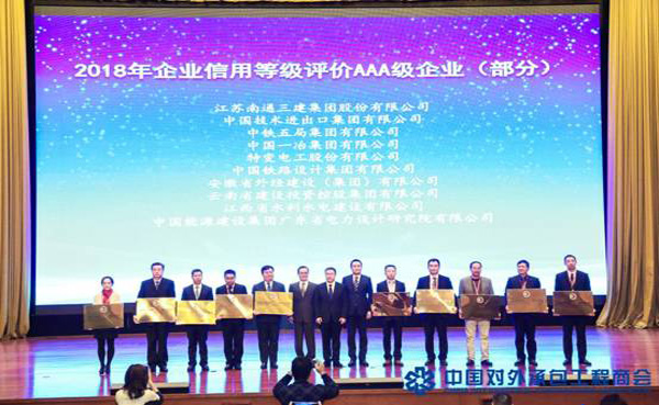 12月5日,中國對外承包工程商會第七屆理事會第四次全體會議在山東濟南隆重召開,來自全國各地的140多家理事單位的300多名代表參加會議。公司董事、海外公司執行董事張周平出席會議。會議頒發了“2018年企業信用等級評價AAA級企業(部分)”牌匾,公司憑借良好的業績和口碑,再次榮獲中國對外承包工程企業信用評價AAA級信用企業,并在現場受邀上臺接受授牌。