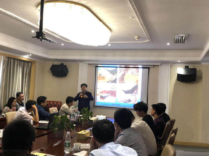 現場參觀結束后,學習團參加了技術培訓和經驗交流會??偨浝碇矶帕柚鞒至碎_班儀式??偣こ處熀櫥?、項目副經理李成,對洋前壩水庫的大壩總布置、大壩施工導流、大壩及供水管道施工技術細節等,通過文字、圖片、視頻等組成的PPT課件為學員授課,并就學員提出的問題逐一進行了解答。