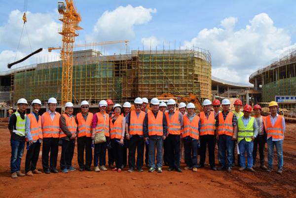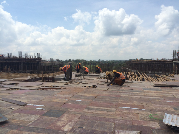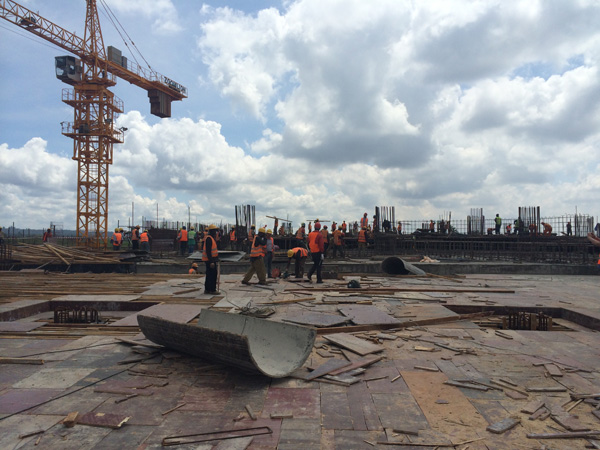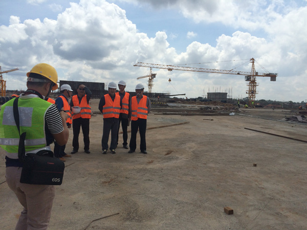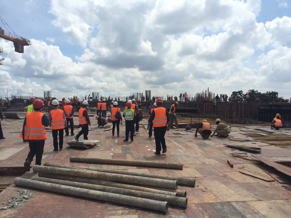 “雙河”項目是一個集零售商場、現(xiàn)代辦公樓、公共娛樂以及配套設(shè)施的綜合性工程,作為東非最大的在建城市綜合體,總建筑面積為18.2萬平方米,單層面積就超過四萬多平米。雖然出國前我對“雙河”項目就有一定的了解,但親臨現(xiàn)場,感受工地的壯觀,內(nèi)心仍然受到巨大的震撼。這個項目涉及到的工程類別較多,施工統(tǒng)籌及安全質(zhì)量監(jiān)控難度較大。在施工現(xiàn)場,我們看到各作業(yè)工種工作安排得井井有條,各類安全標識及安全設(shè)施科學(xué)規(guī)范,雖然現(xiàn)場施工作業(yè)人數(shù)超過1000多人,但讓人感覺既熱火朝天,又忙而不亂有條不紊地進行著。
